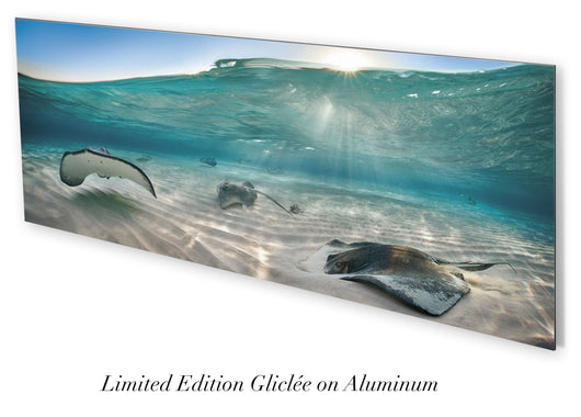 A Stingray feeds in the foreground as the rest of the crowd cruises by in the late afternoon rays. Photographed at "The Sandbar" in Grand Cayman’s North Sound.